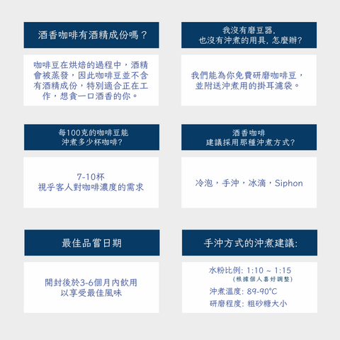 咖啡豆不含酒精成分,所描述的咖啡香氣都是咖啡豆經過發酵處理烘焙後而產生的,在烘焙的過程中酒精已被揮發,請放心飲用。